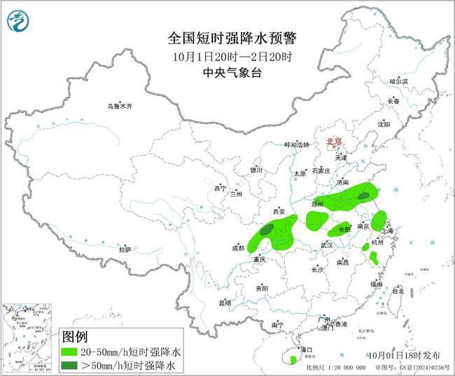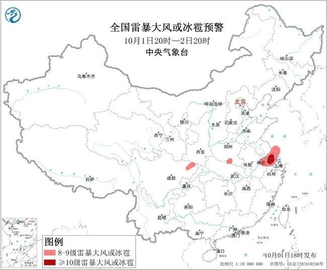 r预计10月1日20时至2日20时,江淮东部、江汉东部、西南地区东部等地的部分地区将有8级以上雷暴大风或冰雹天气,其中,江苏中南部部分地区将有10级以上雷暴大风,最大风力可达11级以上;黄淮南部、江淮东南部、江汉北部、西南地区东部等地的部分地区将有小时雨量大于20毫米的短时强降水天气,其中,江苏北部、四川东北部等地的部分地区小时雨量大于50毫米,最大可达60毫米以上。